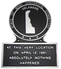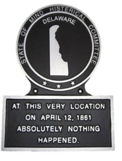The raised wording around the top of the plaque reads, "STATE OF MIND HISTERICAL COMMITTEE". The center has a raised outline of the state and the name of the state. On the bottom of the plaque it reads, "AT THIS VERY LOCATION ON APRIL 12, 1861 ABSOLUTELY NOTHING HAPPENED".